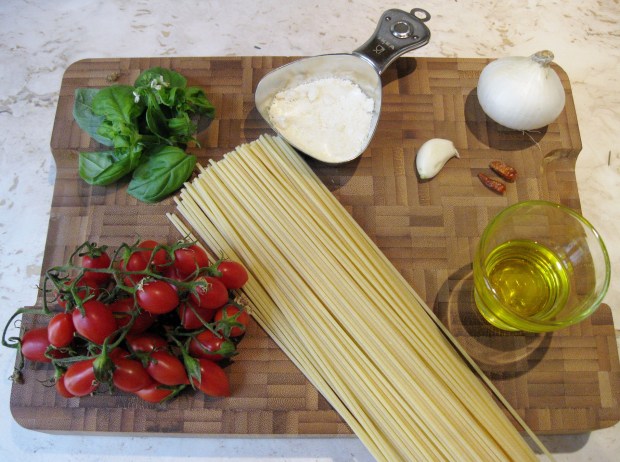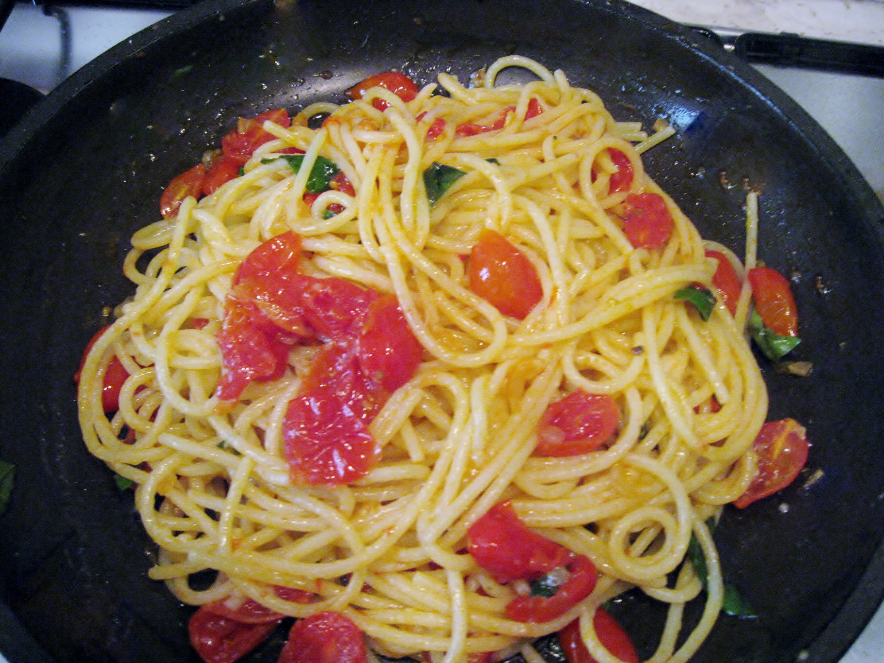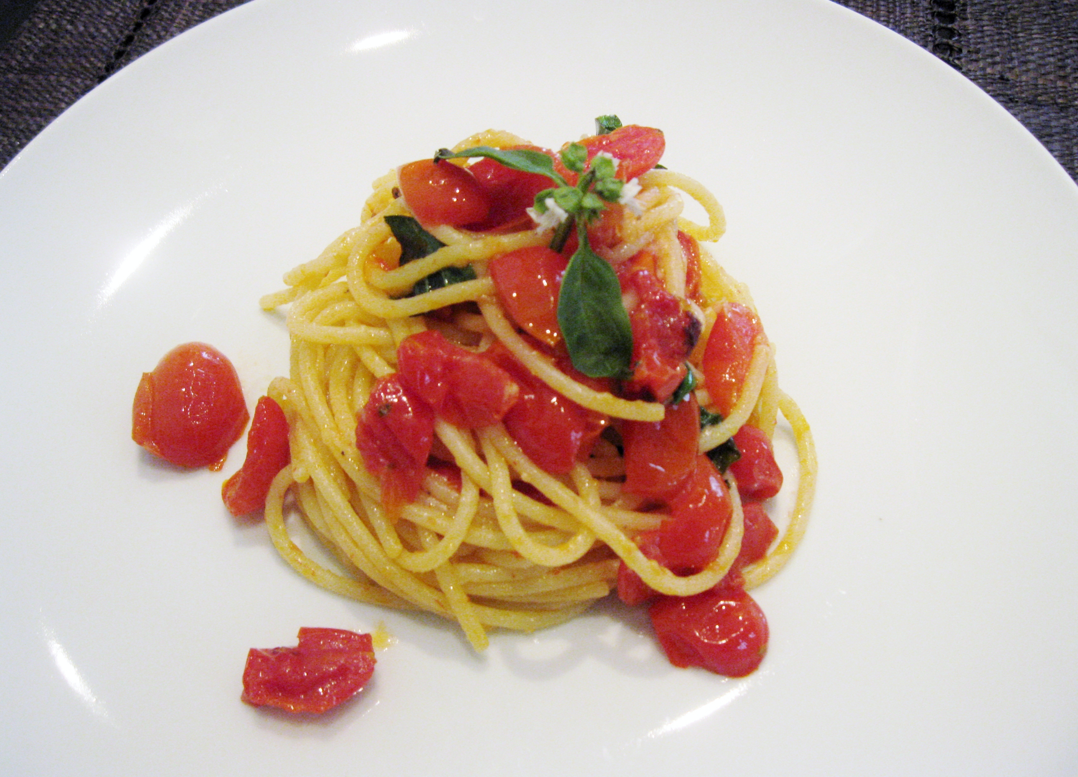 Looking for some interesting ingredients for my “essential” pasta recipe, last saturday morning I headed into the local market near home. Signora Clara, the owner of a lovely vegetable and fruit stand, suggested me to get sweet date tomatoes (I am obsessed with these lately!!), and some fresh basil. My plan was to make a recipe made of tomatoes, basil and pecorino romano and a secret ingredient….