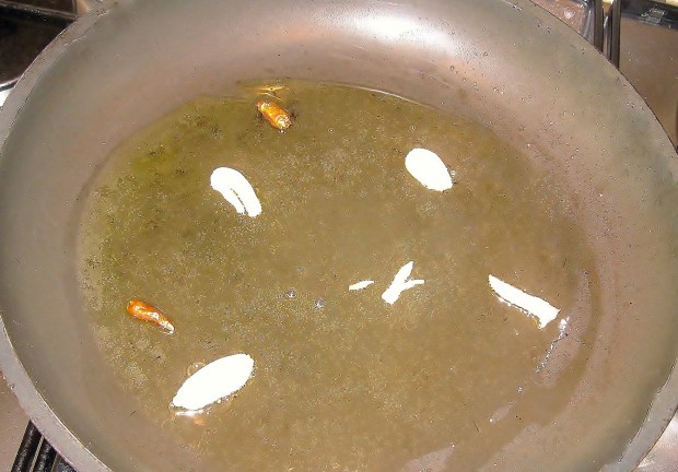 Heat a skillet with extra virgin olive oil (over medium high heat) and place diced garlic and hot peppers. Sautee for about 2-3 minutes to let flavors infuse into olive oil. Discard garlic and hot peppers.