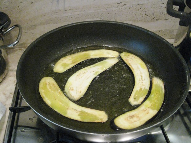 According to Neapolitan tradition, eggplants should only be fried in olive oil, long enough to acquire an intense golden brown color. Fry 4 to 5 slices at a time. In other Italian regions, eggplants are previously dipped in egg batter or/and flour before frying.