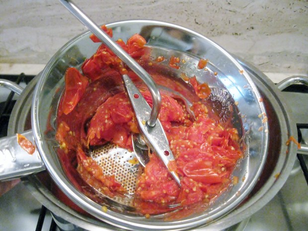 Once blanched, tomatoes are passed through a hand-held vegetable mill.