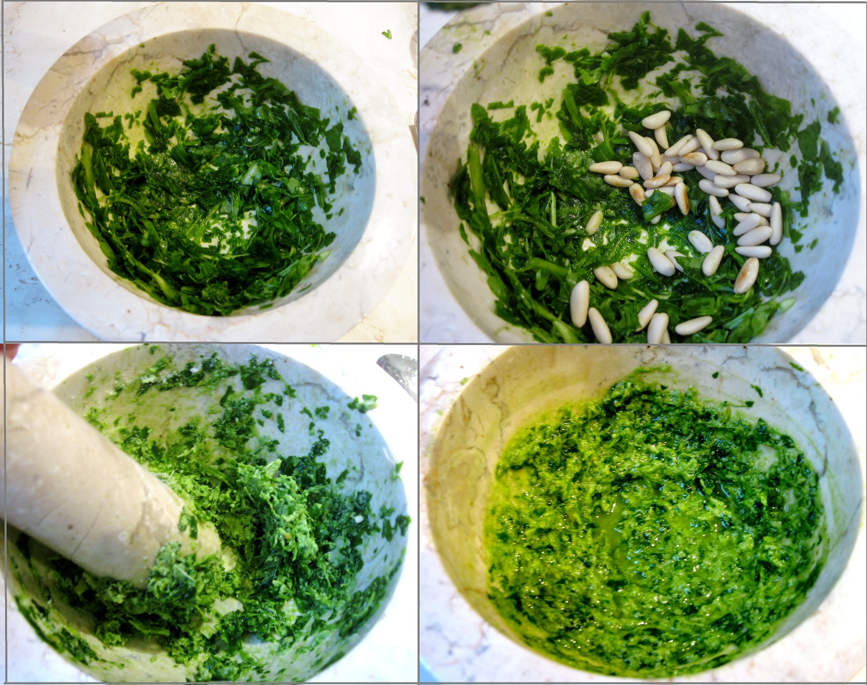To make arugula pesto, use a mortar and pestle. Begin by crushing arugula leaves, and add pine nuts. Crush pine nuts and then add Parmigiano Reggiano cheese. Blend well. Finish pesto by adding extra virgin olive oil. Add salt if needed.