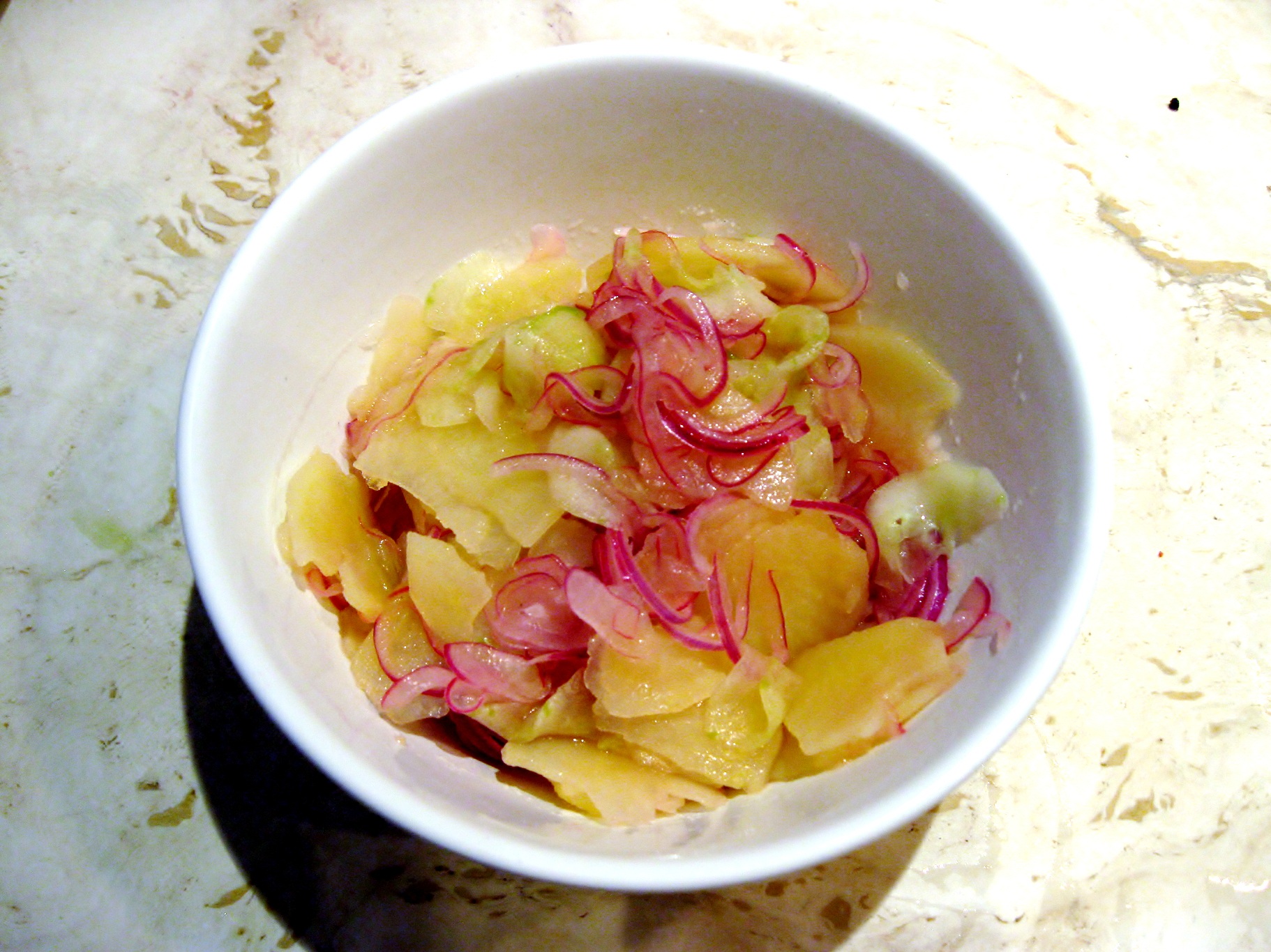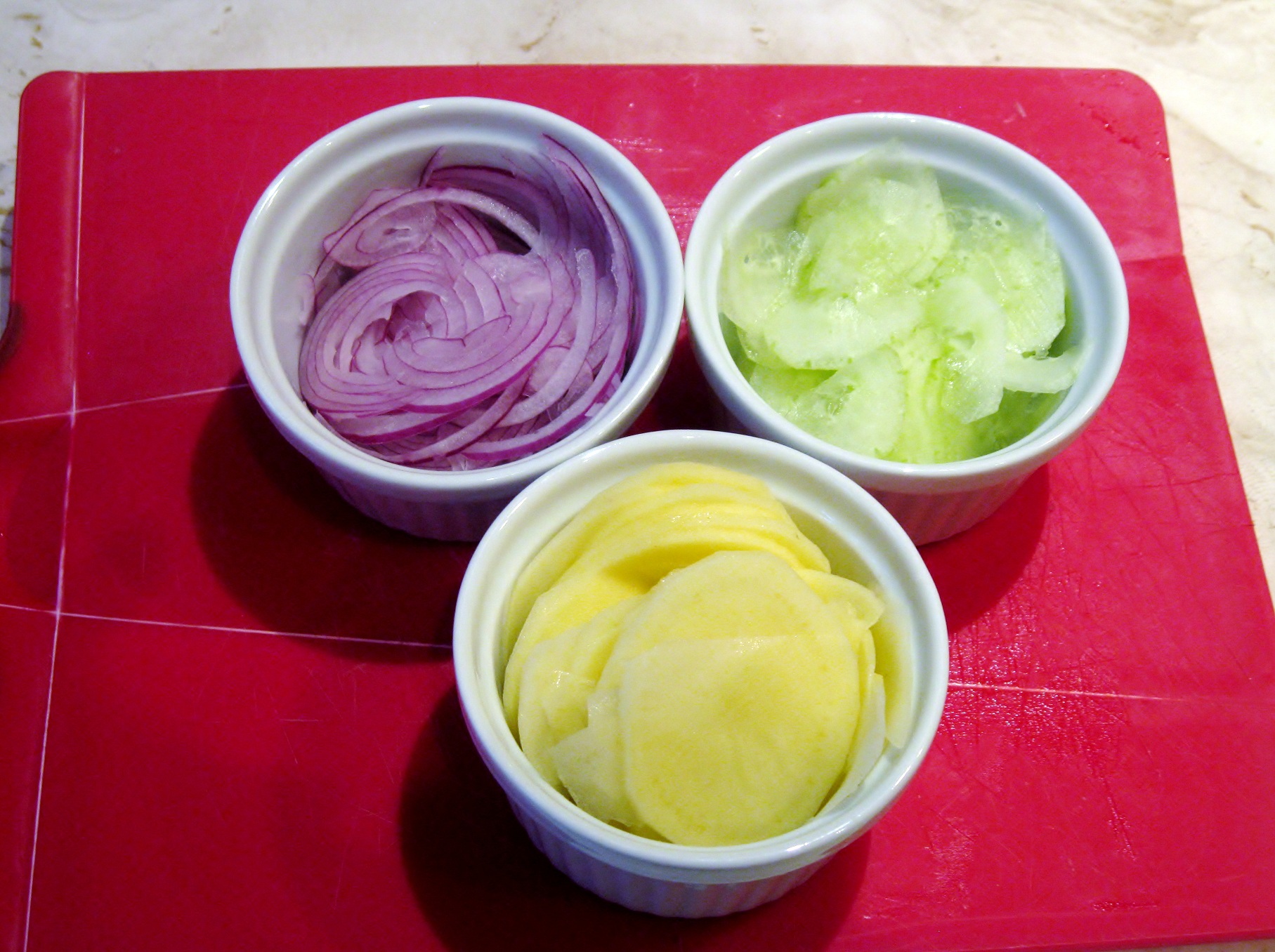 To prepare potato salad, peal potato and slice thinly. Slice red onions and cucumbers thinly.