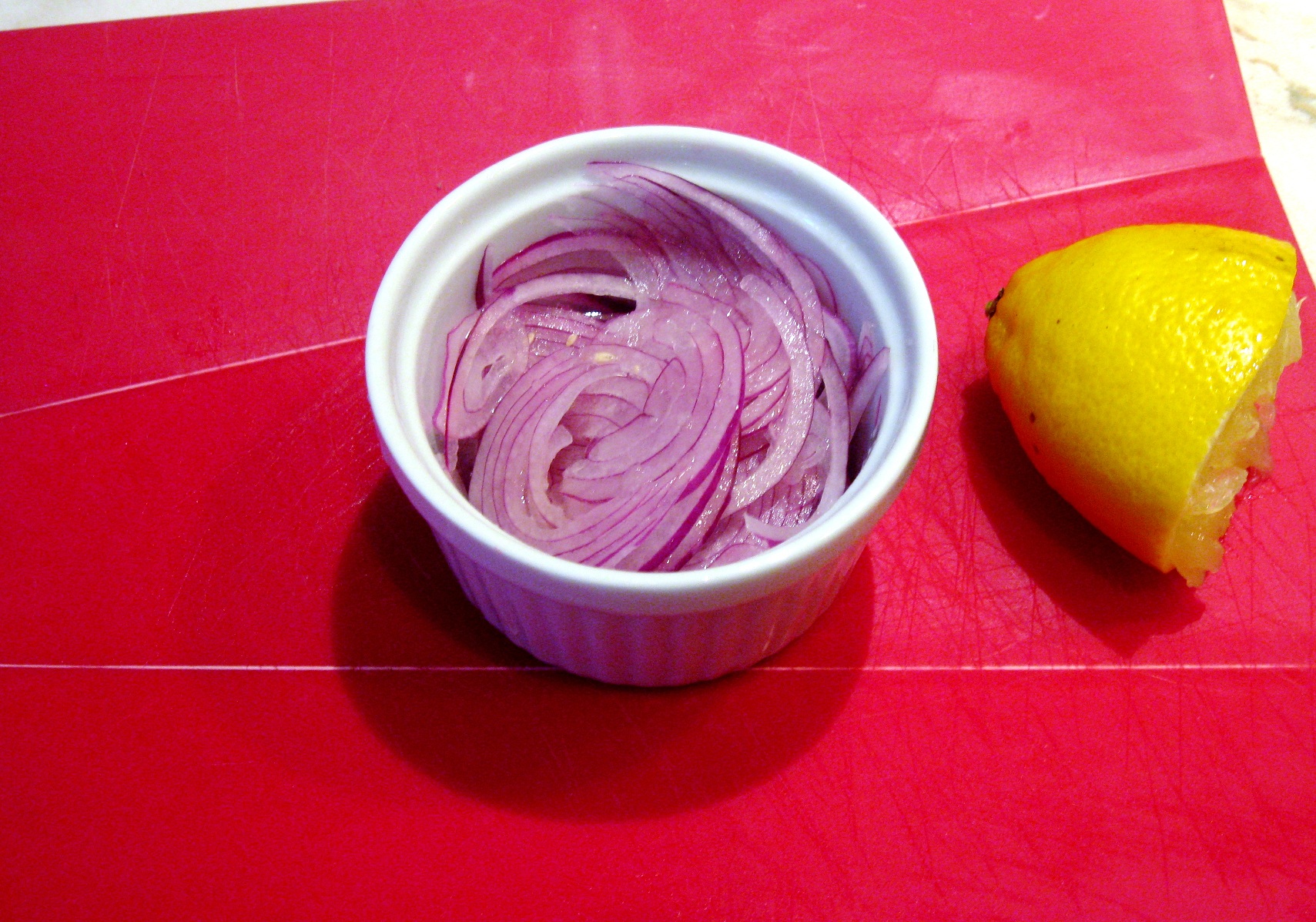 Add lemon juice to red onions and salt to taste. Let is stand for about 30 minutes. This will remove the after taste of onions! Add salt to cucumbers.