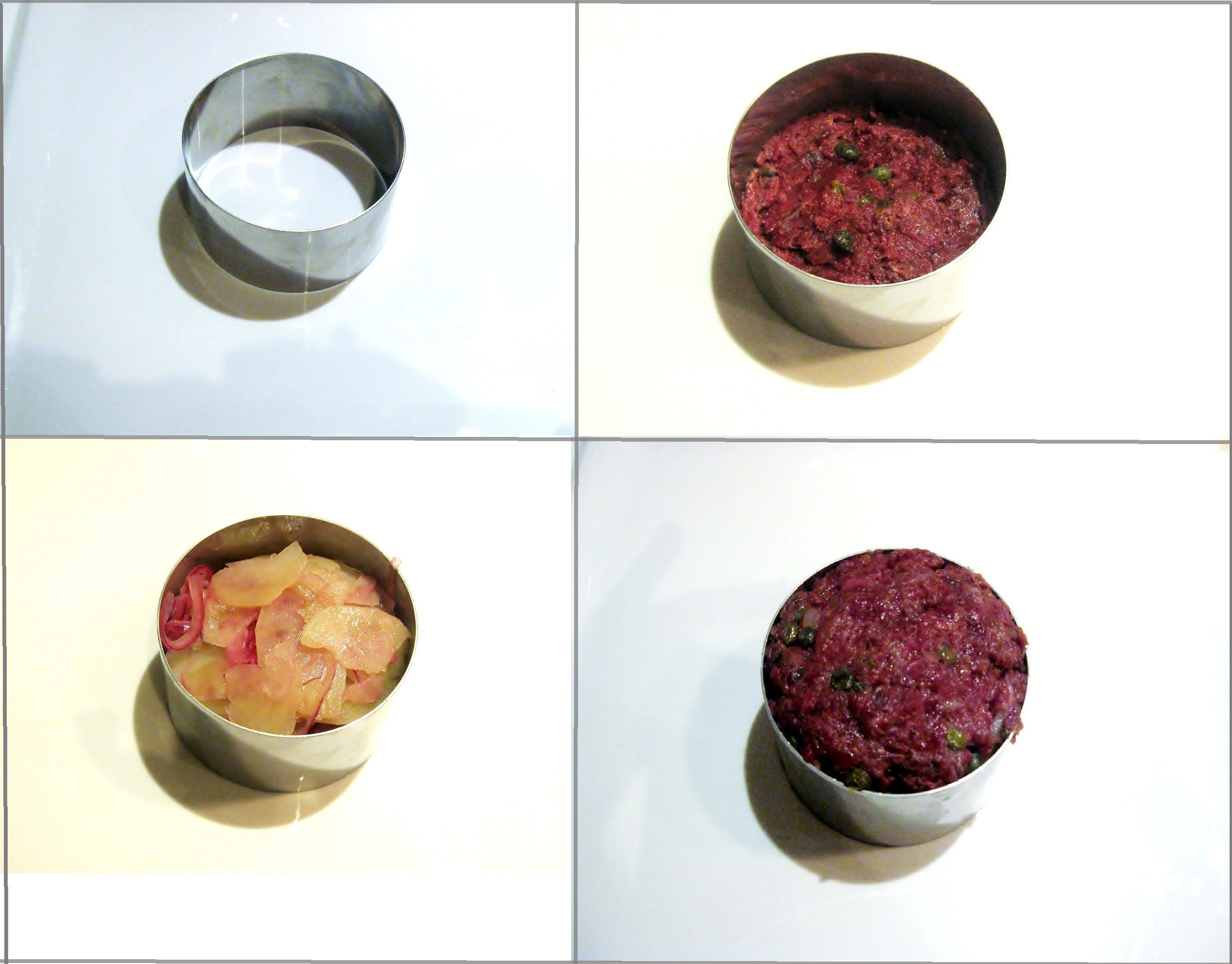 To plate beef tartare, I used a round metal pasta cutter. Place the pasta cutter in the middle of the dish and add about 3 tablespoons of beef tartare. Put about 3 tablespoons of potato salad on top. Finish by placing more beef tartare until it fills the entire pasta cutter. Press it down to firm it up.