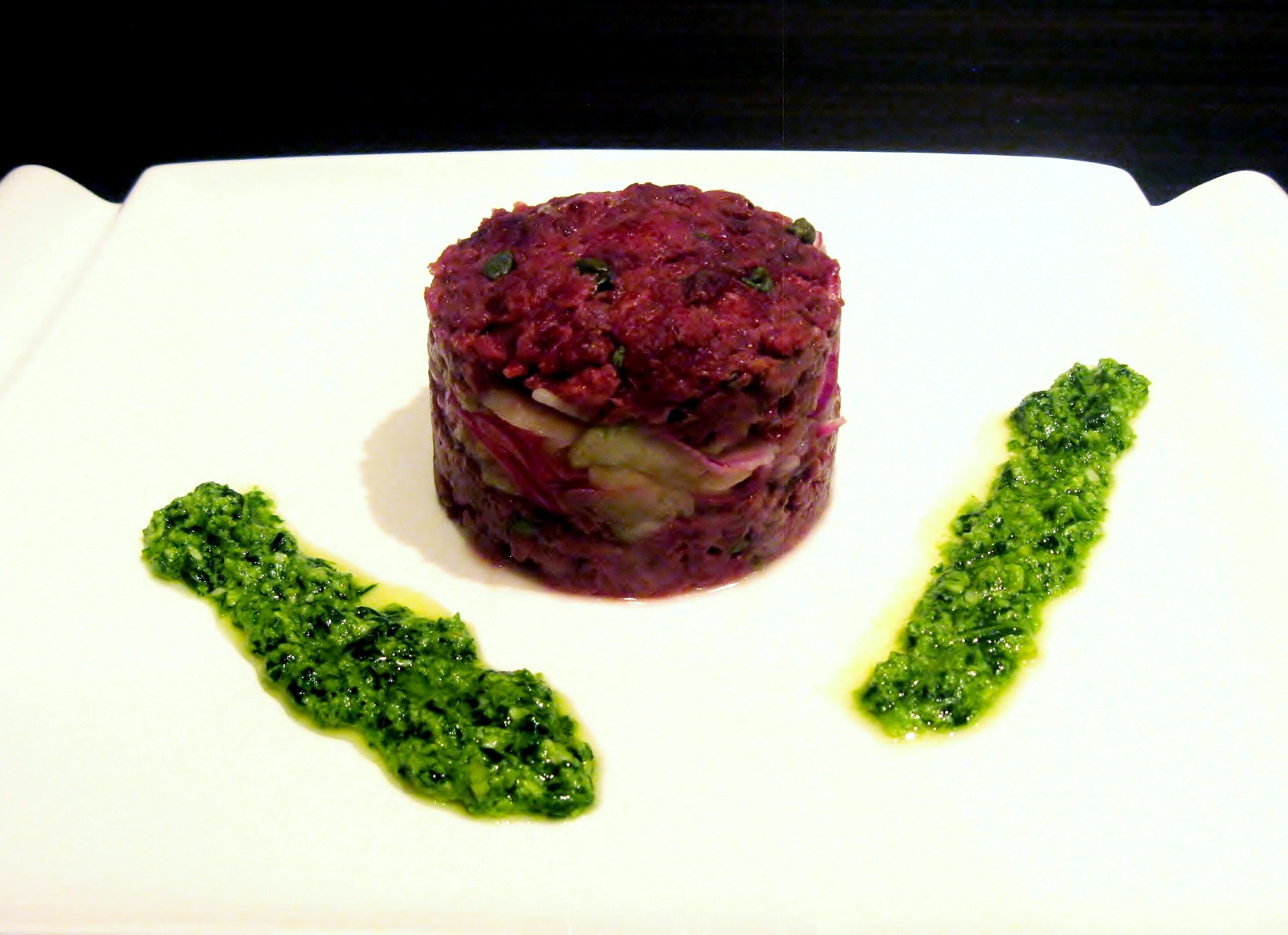 Finish plating by forming two thick strips of arugula pesto on each side of the beef tartare.