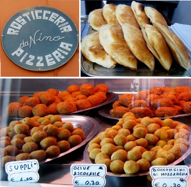 From the top left picture and clockwise: 1. All kinds of fried finger food – mozzarella, chicken, shrimp, olives (olive ascolane), potato croquettes, rice and tomato croquettes (supplì); 2. zucchini pizza; 3. pizza bianca (or white pizza which is just plain pizza dough); and 4. pizza Margherita (pizza with tomatoes and mozzarella).