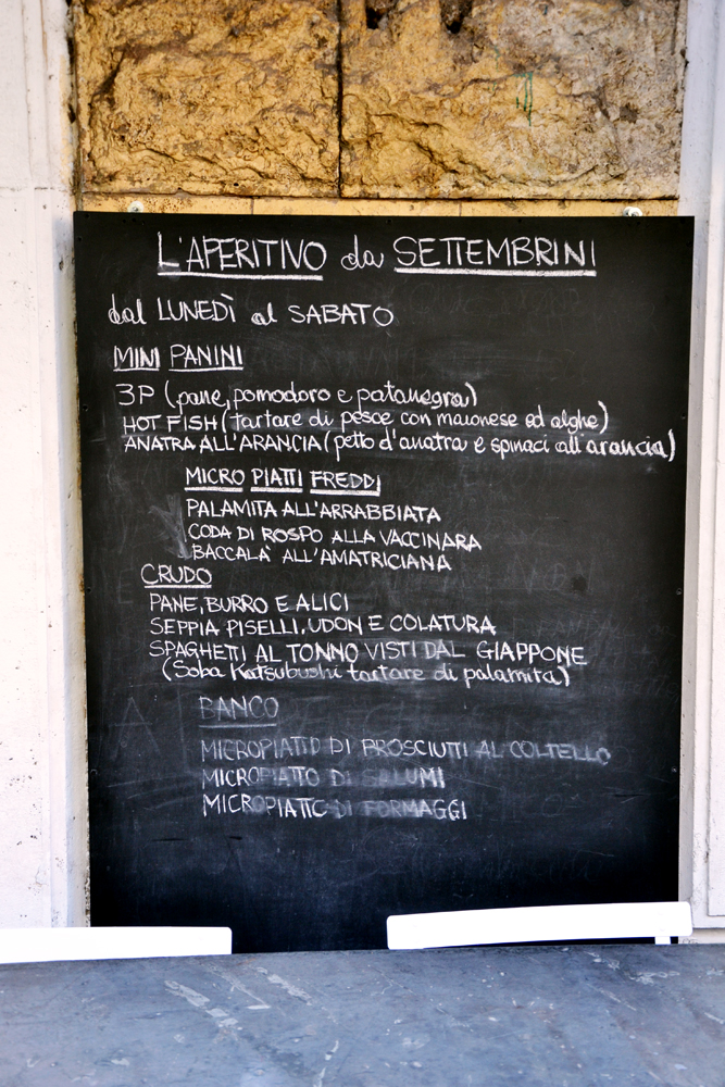 Besides an excellent and vast wine list, Settembrini prepares great cocktails served with scrumptious finger food: small panini with mozzarella, tomatoes and pata negra ham; fish tartare with mayonnaise and seaweed; duck breast with spinach and orange; Japanese style tuna spaghetti; bread, butter and anchovies.