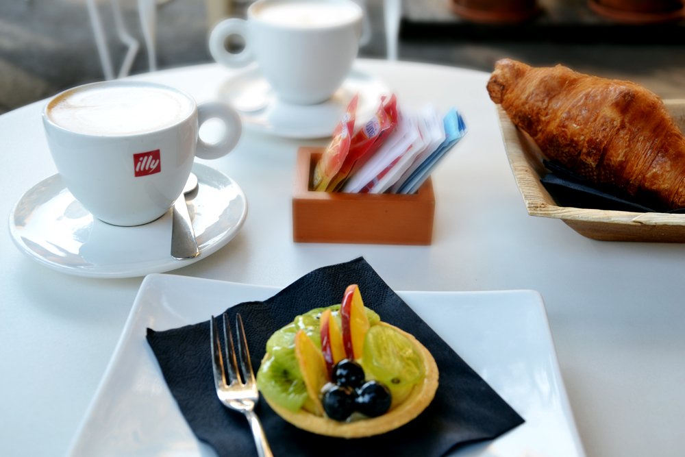 Below our breakfast this morning: two delicious cappuccinos, one croissant and a fruit tart.