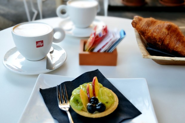 ………Below our breakfast this morning: two delicious cappuccinos, one croissant and a fruit tart.”