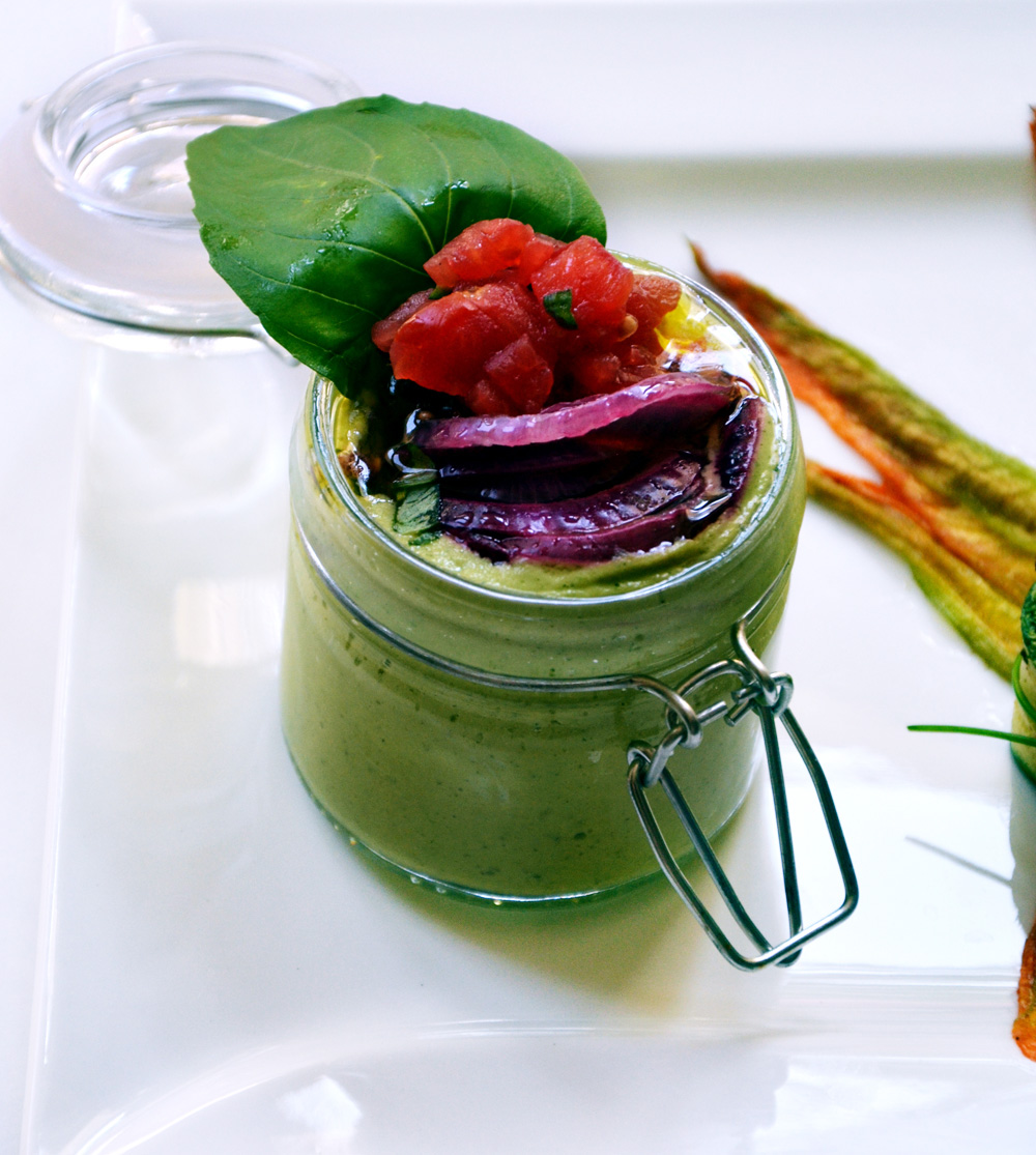 Using a small jar or glass, pour zucchini cream, place marinated red onion slices on top and finish it with the diced concassé tomatoes. Drizzle with olive oil and place a large basil leave for garnish.