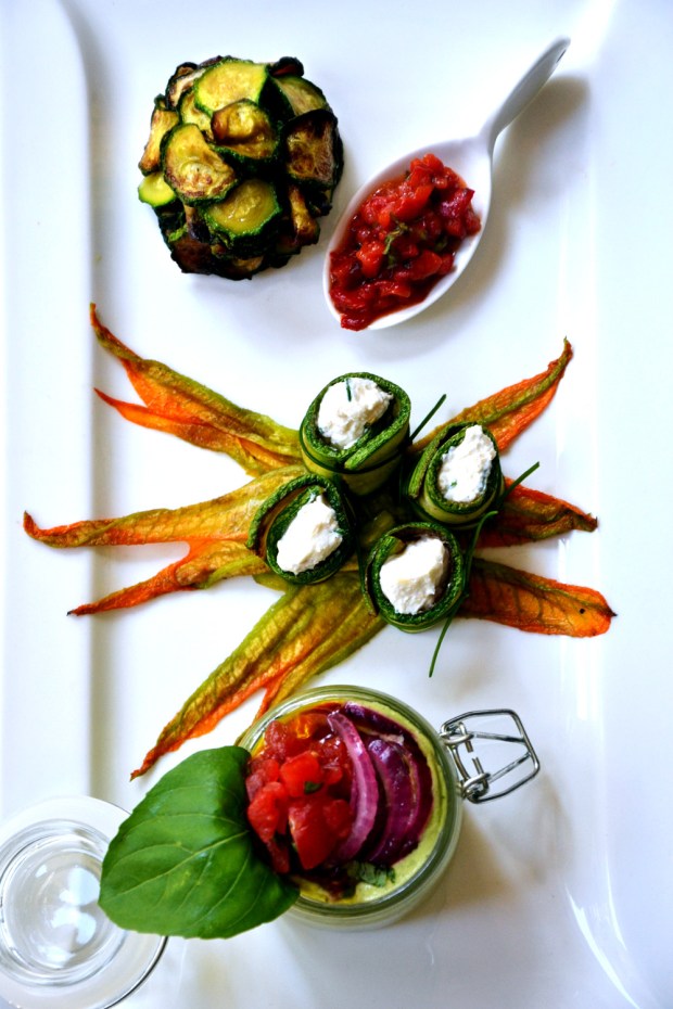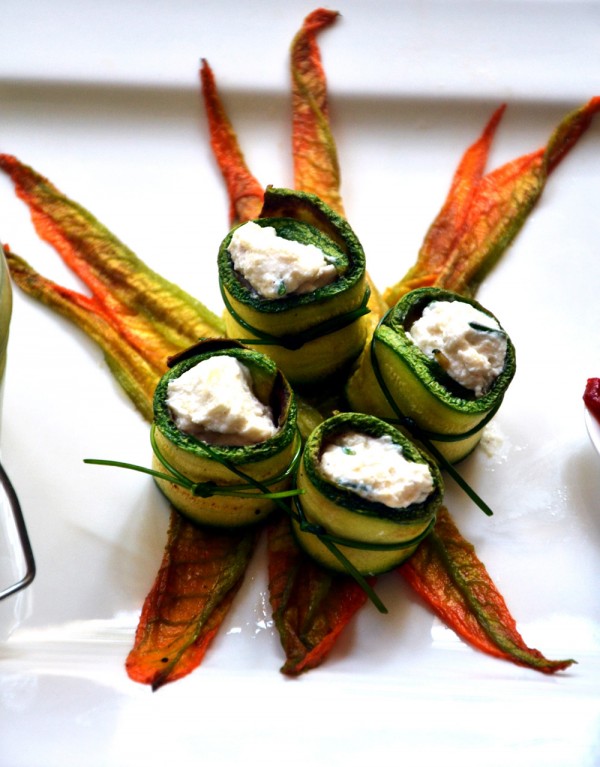 This is such a beautiful main course, Ambrosiana. I would be stunned to sit at a friend’s table and have this plate set before me. The zucchini rolls set atop the blossoms are really quite special, a feast for both eyes and palate.
