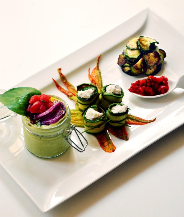 Zucchini rolls with ricotta, pine nuts, chives and cinnamon filling