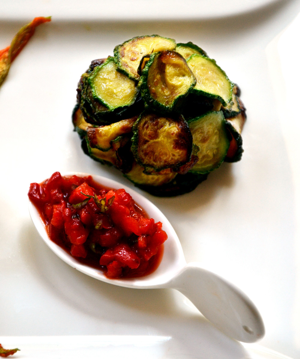 Using an expresso coffee cup or another small cup, cover the inside with plastic wrap and place zucchinis that previoulsy have been drained form all liquids. Press the mixture with a spoon to firm it up and place the zucchini cup upside down into a plate and gently pull the cup and plastic wrap up. Using a serving spoon (I used a ceramic one), place red pepper sauce besides the zucchini.