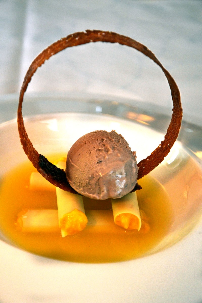 Citrus soup with black olive gelato, white chocolate cannoli stuffed with mango and a star anise arc